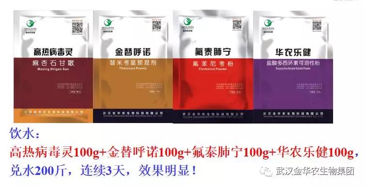 1、【白天控水集中4小時(shí)內(nèi)喝完,飲水高熱病毒靈100克+金替呼諾100克+氟泰肺寧100克+華農(nóng)樂健100克,兌水200斤,連續(xù)3天,效果明顯!