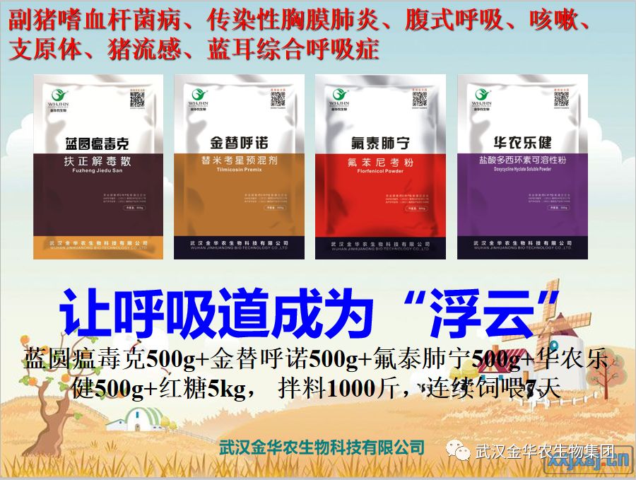 藍圓瘟毒克500 g+金替呼諾500g+氟泰肺寧500g+華農樂500g+紅糖5kg,拌料1000斤,連續飼喂7天,對各種病毒細菌性呼吸道,效果明顯。