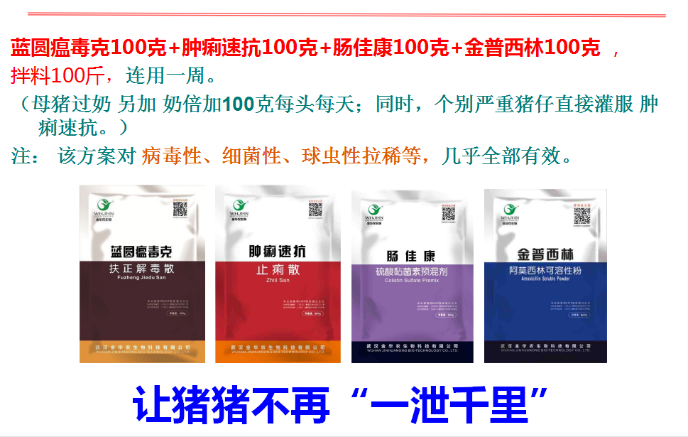 斷奶仔豬,拉稀,腹瀉,傳染性胃腸炎,流行性腹瀉,仔豬黃白痢疾,斷奶后仔豬:藍圓瘟毒克100克+腫痢速抗100克+腸佳康100克+金普西林100克 ,拌料100斤,連續飼喂3天,立即止痢,效果異常明顯!