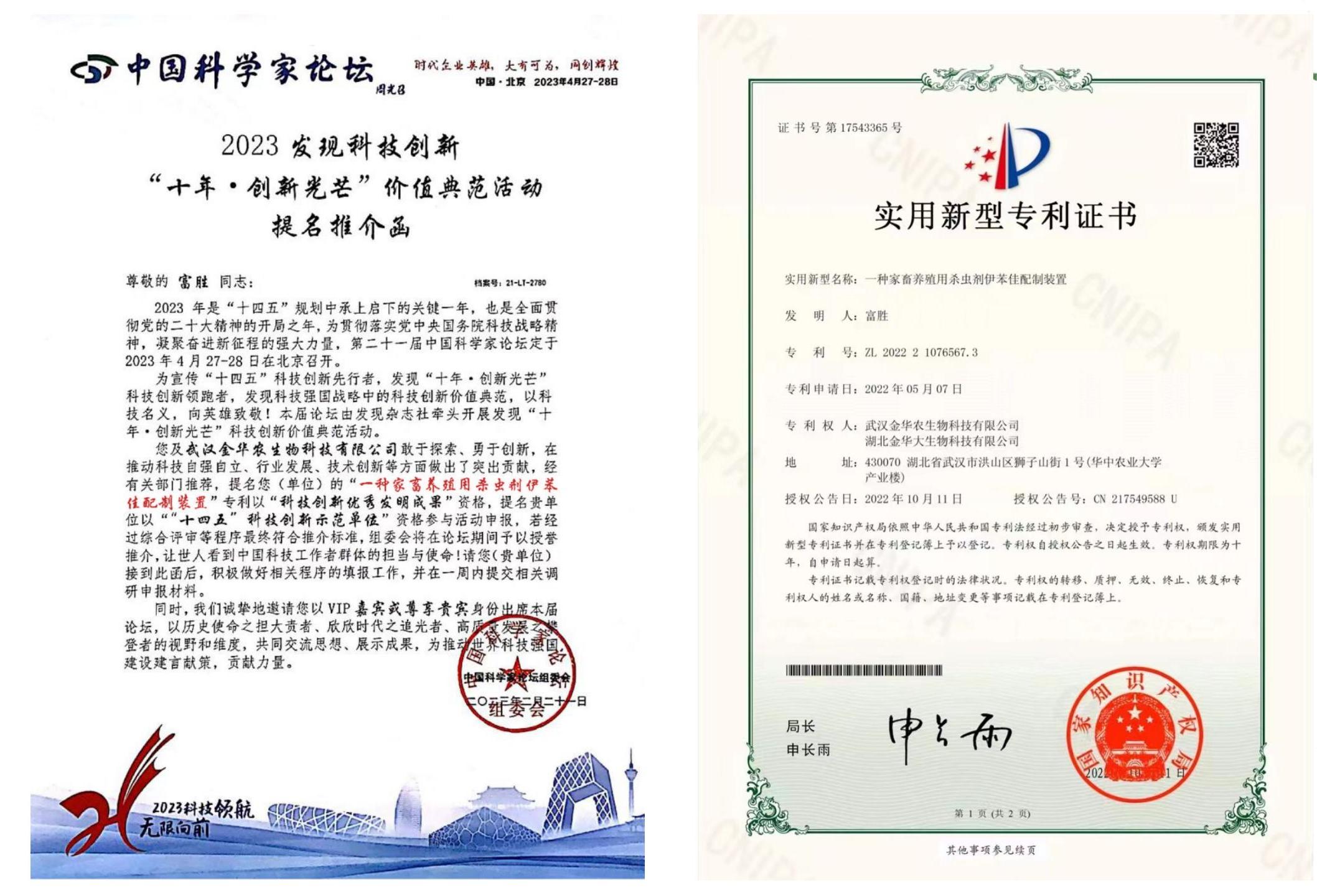 武漢金華農生物科技有限公司在推動行業發展、科技創新、成果轉化等方面做出積極努力與貢獻,經有關部門推薦,我司一項“有效提高家畜養殖用殺蟲劑伊苯佳工藝配制”(專利證書字第17543365號)專利擬作為第二十一屆中國科學家論壇優秀成果重點推介,并提名入圍“科技創新優秀發明成果”。同時,我司還提名入圍“十四五”科技創新示范單位。