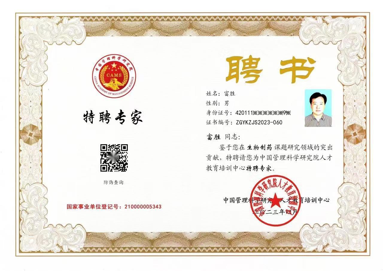 中國科學研究院“生物制藥”榮譽證書
