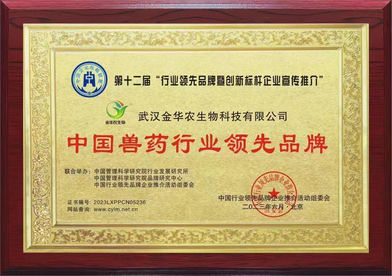 卯兔年未過半,武漢金華農(nóng)已迎來諸多利好消息。公司業(yè)績突飛猛進(jìn),銷量翻番;公司獲得省農(nóng)業(yè)農(nóng)村廳第一批新版GMP獸藥文號、飼料添加劑45個新品種批號;公司憑借專業(yè)技術(shù)、創(chuàng)新發(fā)展、高效服務(wù),被國家信用平臺、品牌強(qiáng)國計劃評選為“獸藥飼料添加劑行業(yè)典范企業(yè)”。近日,公司又在中國科學(xué)研究院組織的全國自主品牌研發(fā)、科研創(chuàng)新產(chǎn)品、質(zhì)量品控管理、高校產(chǎn)學(xué)研基地建設(shè)的評選活動中,經(jīng)嚴(yán)格篩選,層層選拔,考核評比,監(jiān)督審查,被中國科學(xué)研究院組委會授予“中國獸藥行業(yè)領(lǐng)先品牌”榮譽(yù)稱號。