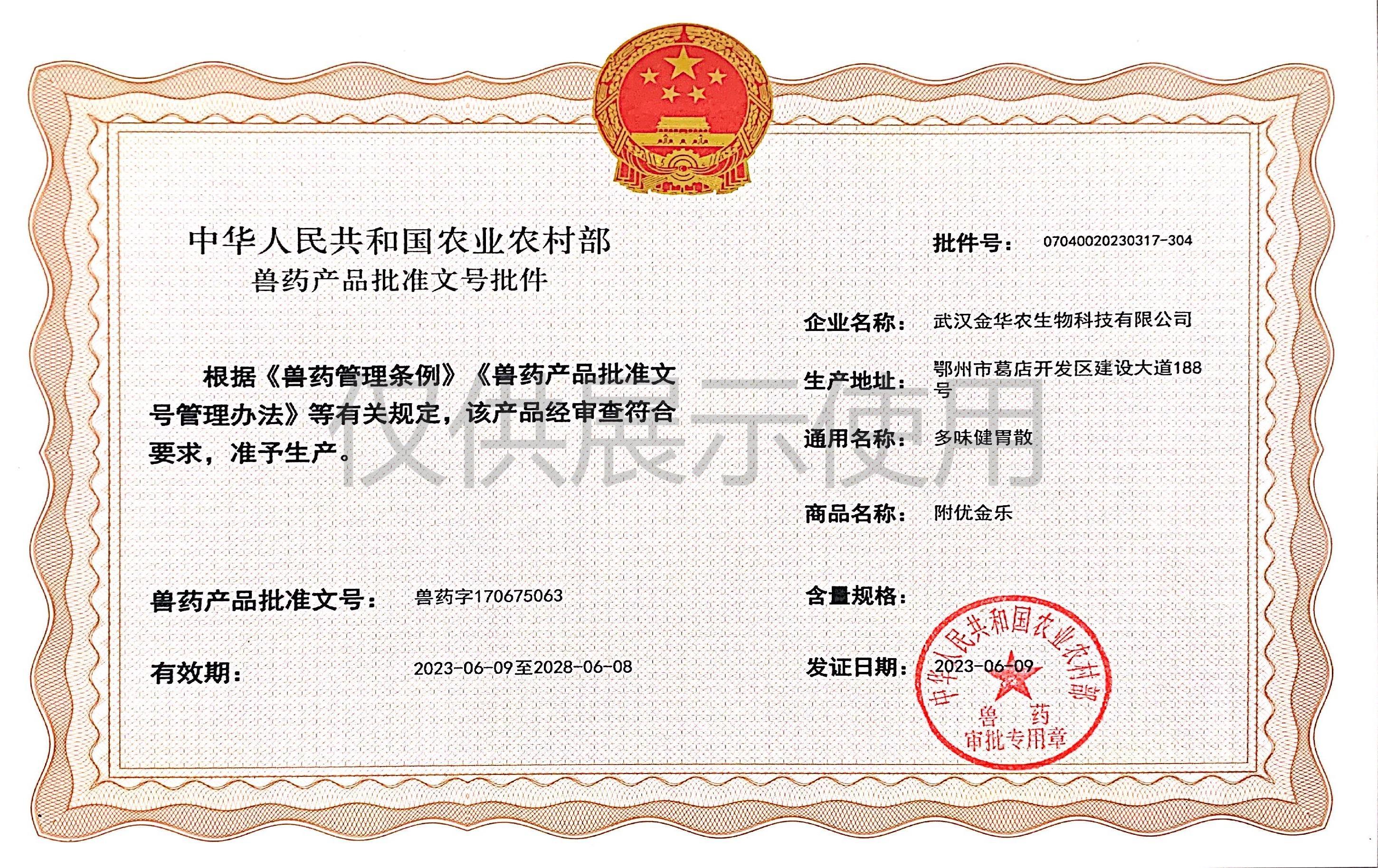 根據《獸藥管理條例》和《獸藥產品批準文號管理辦法》的規定,經農業農村部審查,準予核發武漢金華農生物科技有限公司(以下簡稱“武漢金華農生物”)國家新版GMP6種獸藥相關產品批準文號,這是繼今年5月我司獲得第一批新版GMP獸藥批準文號后再一次獲得獸藥產品批準文號。