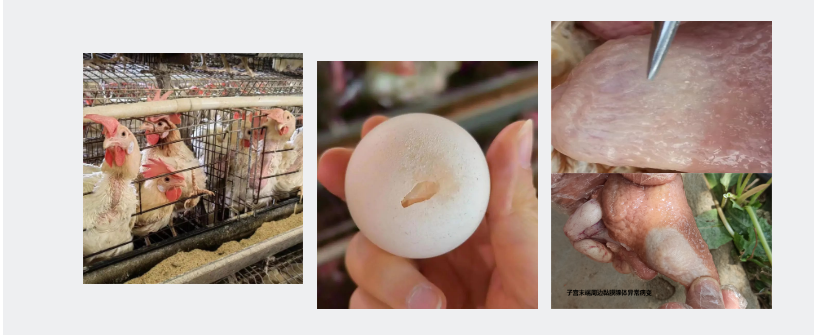 ? ? ? (1)寧經理所在區域禽類養殖較多,近日接到廣西某禽類養殖場求助,說目前部分日齡300天的雞出現了雞冠蒼白、雞冠薄、倒冠,產蛋率由96%下降到85%,蛋殼質量差、破殼蛋、薄殼蛋多的癥狀。經剖檢發現雞腎臟萎縮、肝臟萎縮,卵泡數量減少,輸卵管子宮部末端有白色病變,同日將檢測圖譜、剖檢情況上報武漢金華農生物公司技術診斷中心,初步確診為雞傳染性貧血病與滑液囊支原體混感,立即給出控制方案:金替呼諾+華農樂健+金泰樂欣,3天后回訪,雞群采食量上升,狀態明顯好轉,呼吸道減輕,癱雞減少,10天后蛋層上升2.5個點。