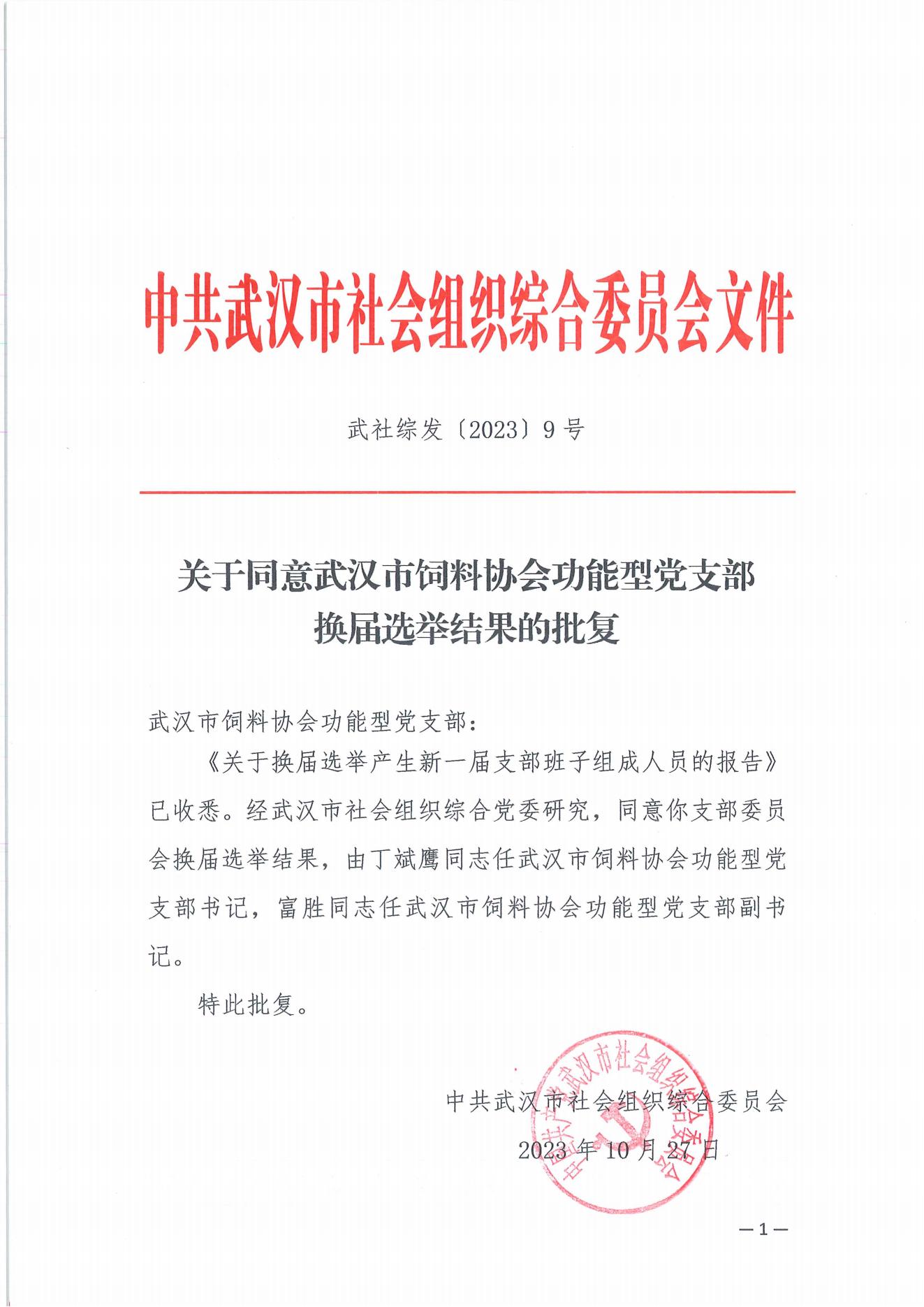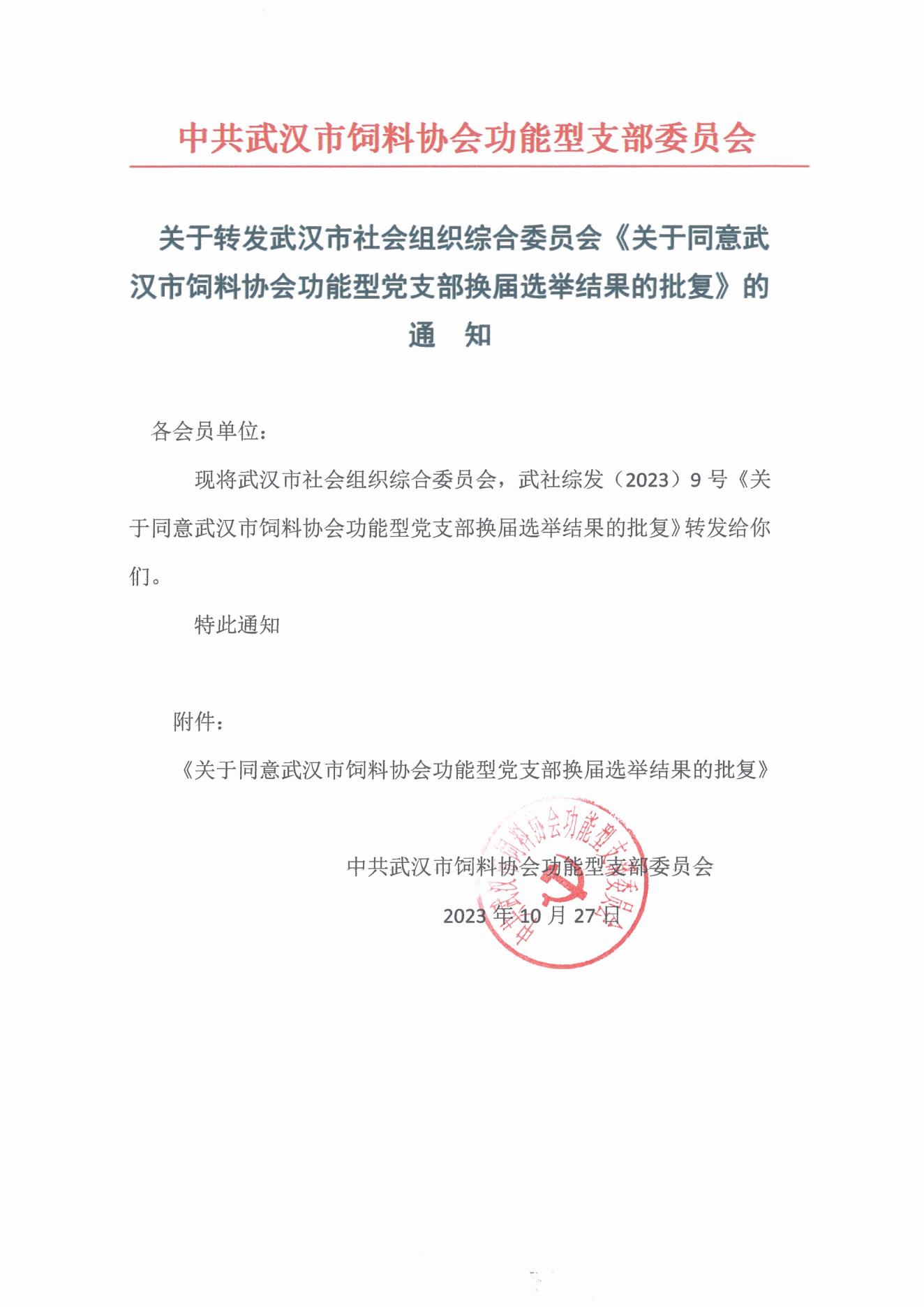 ? ? ? ?會議下發(fā)了關于武漢市飼料協(xié)會功能型黨支部換屆選舉結果的批復。經(jīng)武漢市社會組織綜合黨委研究,同意武漢市飼料協(xié)會黨支部委員會換屆選舉的結果,由丁斌鷹同志任武漢市飼料協(xié)會功能型黨支部書記,富勝同志任武漢市飼料協(xié)會功能型黨支部副書記。