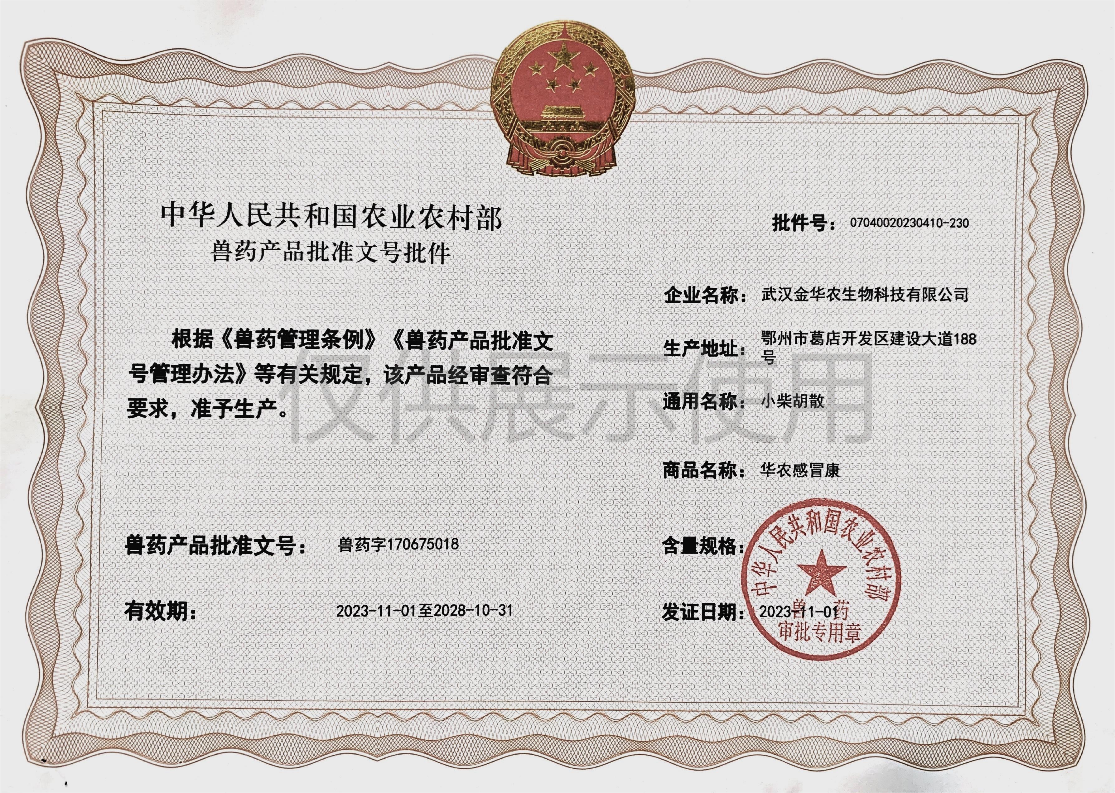 ? ? ??根據(jù)《獸藥管理條例》和《獸藥產(chǎn)品批準(zhǔn)文號管理辦法》的規(guī)定,經(jīng)農(nóng)業(yè)農(nóng)村部審查,準(zhǔn)予核發(fā)武漢金華農(nóng)生物科技有限公司2個新版GMP獸藥相關(guān)產(chǎn)品批準(zhǔn)文號。