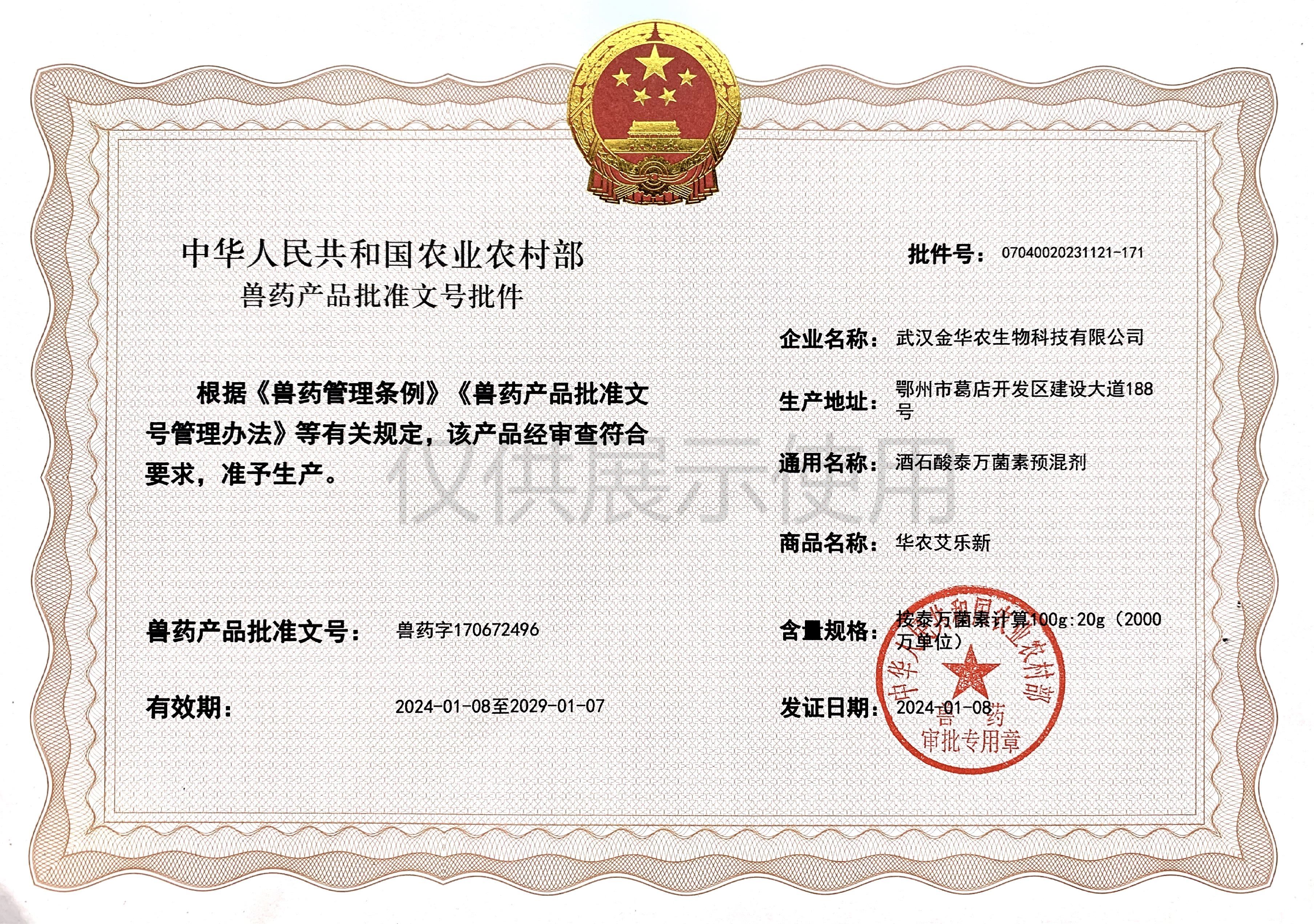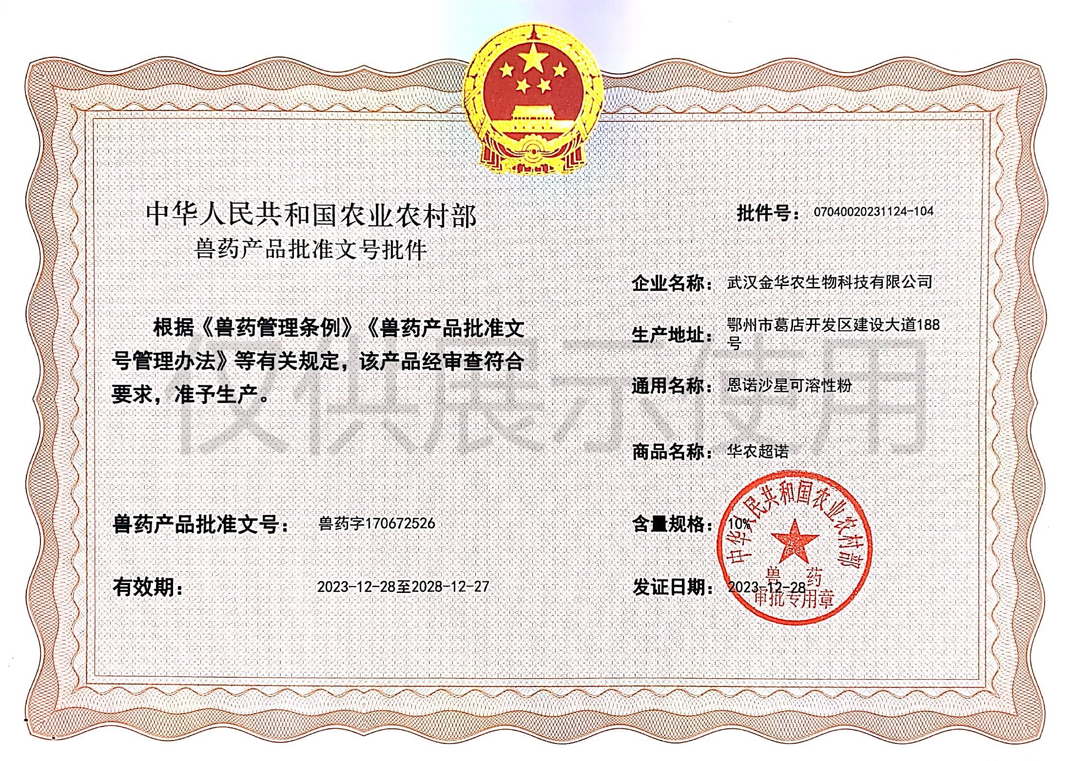 根據(jù)《獸藥管理條例》和《獸藥產(chǎn)品批準文號管理辦法》的規(guī)定,經(jīng)農(nóng)業(yè)農(nóng)村部審查,準予核發(fā)武漢金華農(nóng)生物科技有限公司2個新版GMP獸藥相關產(chǎn)品批準文號。