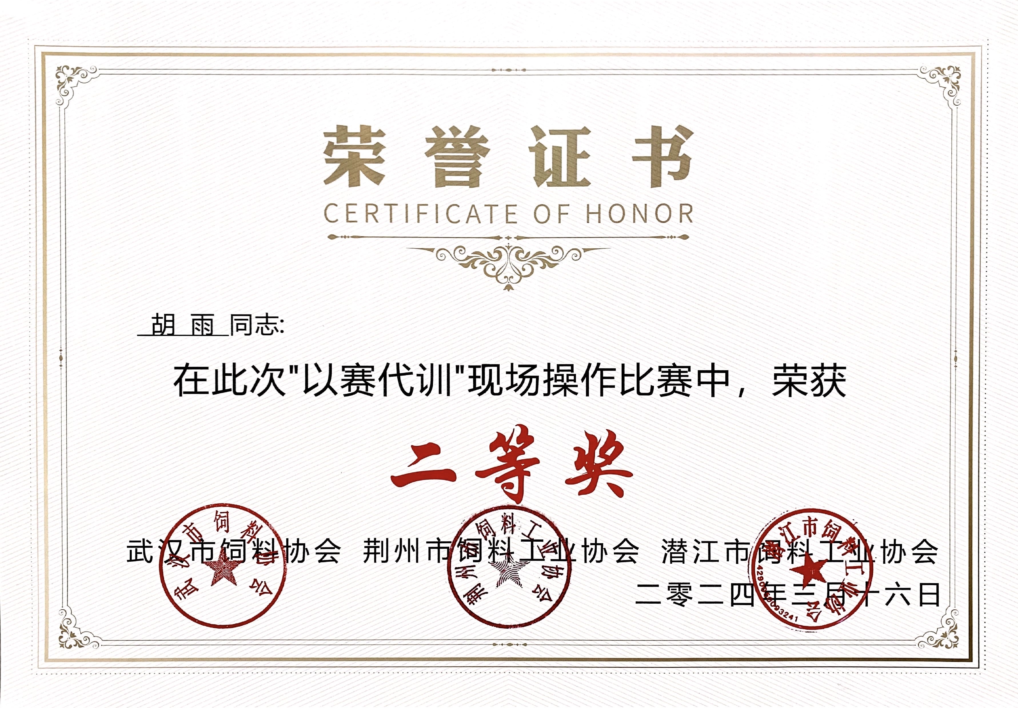 ? ? ? ?在此,我們對胡雨同志表示熱烈的祝賀,并希望他能夠繼續保持謙虛、勤奮的態度,不斷提升自己的專業技能,為公司的發展做出更大的貢獻。同時,公司也會繼續加強人才培養和專業技能提升工作,為飼料動保行業的健康發展做出更大的貢獻。