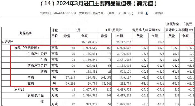 4月18日,海關總署發布最新數據,2024年3月中國進口肉類(包含雜碎)58萬噸,同比下降11.4%;總進口金額為142.1億人民幣,同比下降11.6%。