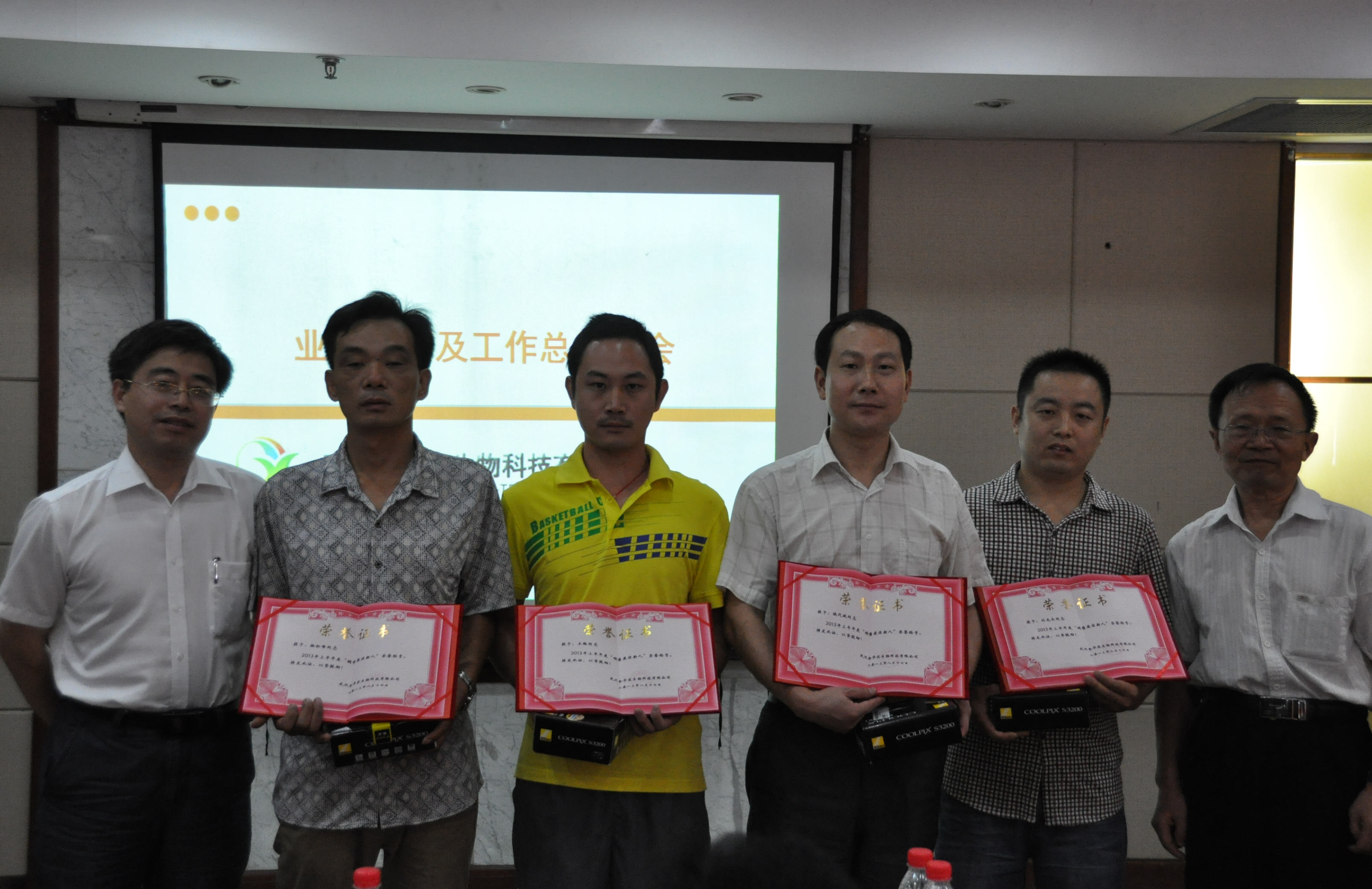 公司領導富勝總經理、肖后軍所長、李仁剛處長、姚寶安教授、齊德生教授,一起為銷售業績突出、表現優秀的市場精英們頒發獎品和榮譽證書。
