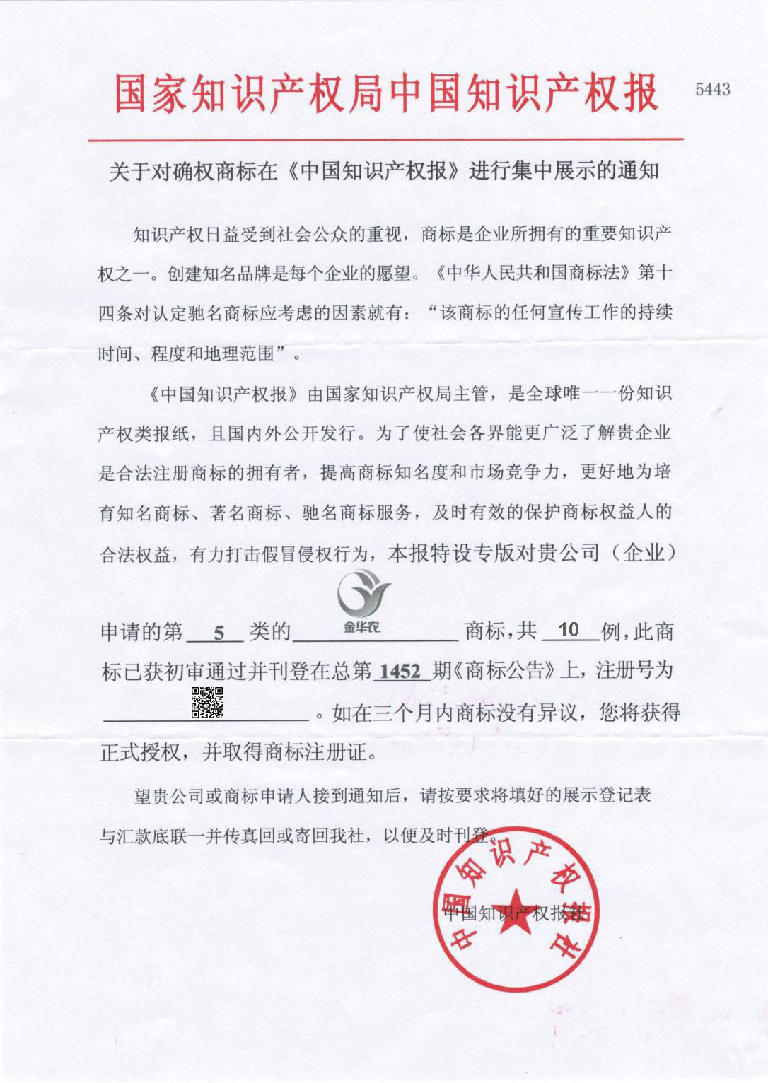 7月22日, 武漢金華農生物喜獲國家工商總局頒發“馳名商標”認證。經國家知識產權局授權,中國知識產權報、中國商報社聯合對武漢金華農生物品牌戰略規劃、馳名商標事項等進行專題報道。