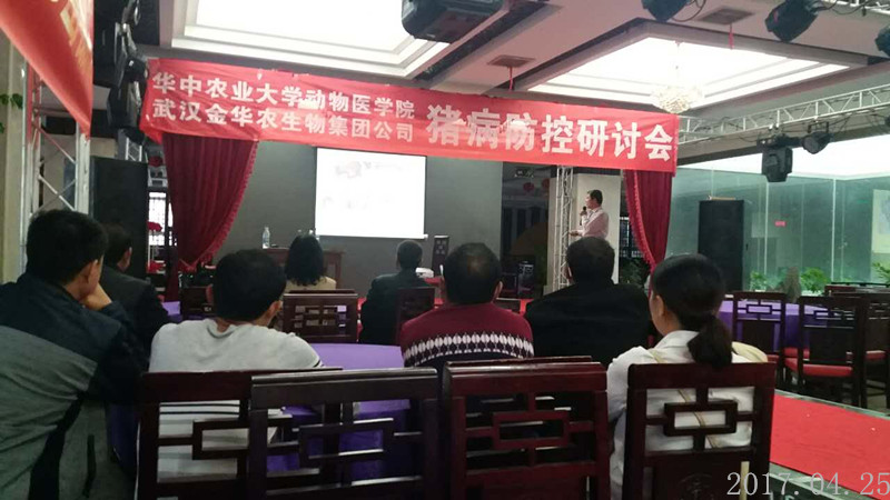 4月25日,武漢金華農春夏季規模化豬場疾病研討會,在湖北天門市勝利召開,此次會議由公司戰略合作伙伴----湖北天門畜牧局獸藥經銷公司趙總、顏老師組織與策劃,由湖北省大區團隊劉總、姚老師、陳經理、江經理負責疾病防控專題宣傳,來自該市120多家規模化養殖場客戶參加交流學習,豬病問題現場互動解答,會議氣氛熱烈。