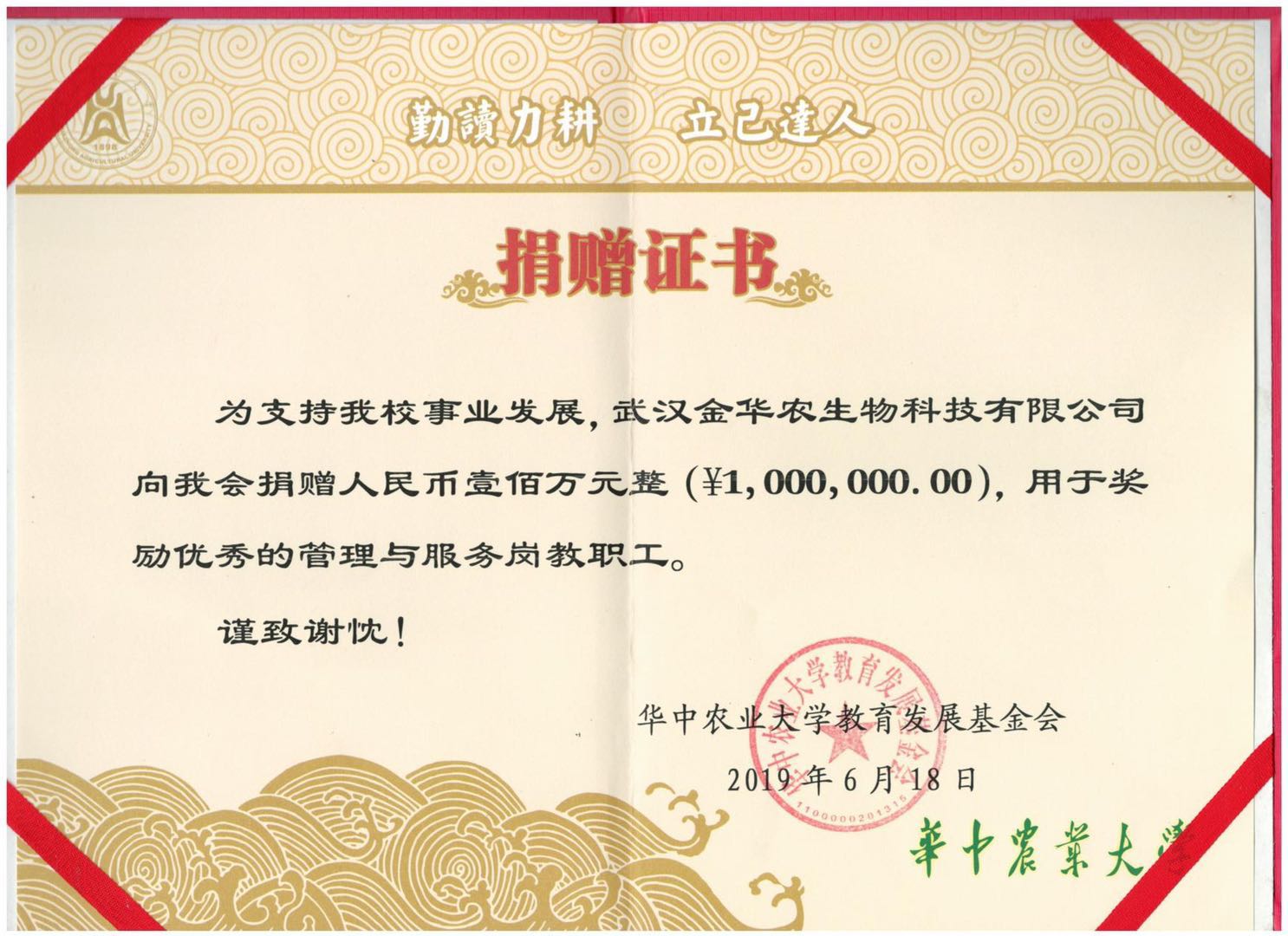 華中農(nóng)業(yè)大學(xué)向武漢金華農(nóng)生物頒發(fā)捐贈(zèng)證書(shū)