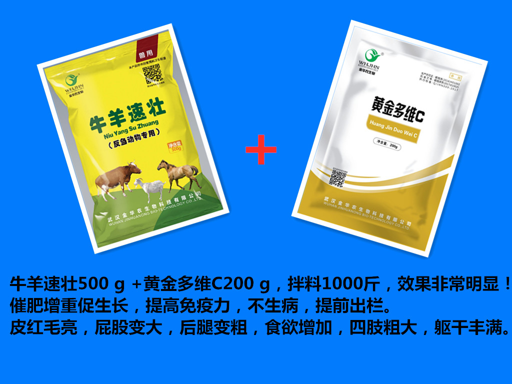 肉牛、肉羊、肉驢、馬(反芻動物),催肥增重促生長,提高免疫力,不生病,提前出欄,從開口吃料開始飼喂,一直到出欄為止,皮紅毛亮,屁股變大,后腿變粗,食欲增加,四肢粗大,軀干豐滿,增重快,生長迅速,多長30-50斤肉,至少提前15-20天出欄肉質鮮美,口感好:牛羊速壯500 g +黃金多維C200 g,拌料1000斤,效果非常明顯!