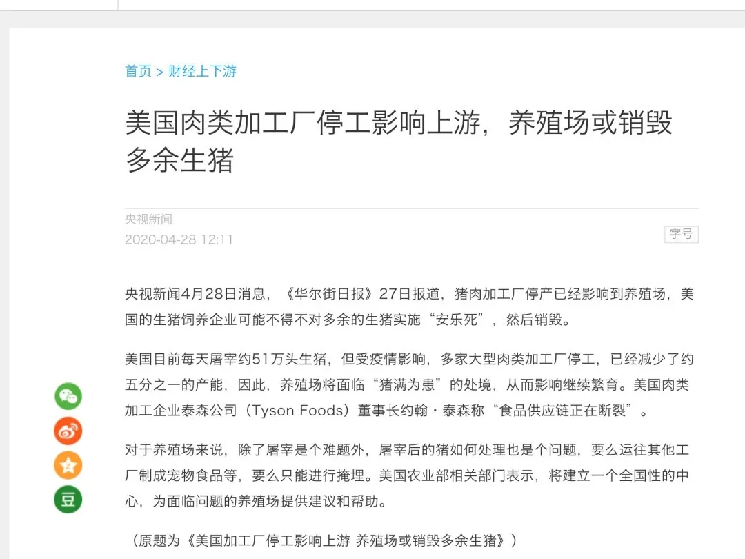 ? ? ? ?全球最大的豬肉生產(chǎn)商美國(guó)史密斯菲爾德食品公司隔日也宣布關(guān)閉在伊利諾伊州的一家廠房。隨后,美國(guó)知名的豬肉加工企業(yè)、全球最大的火雞生產(chǎn)商荷美爾食品公司也關(guān)閉了明尼蘇達(dá)州的火雞肉加工廠和印第安納州的大型豬肉屠宰場(chǎng)。
